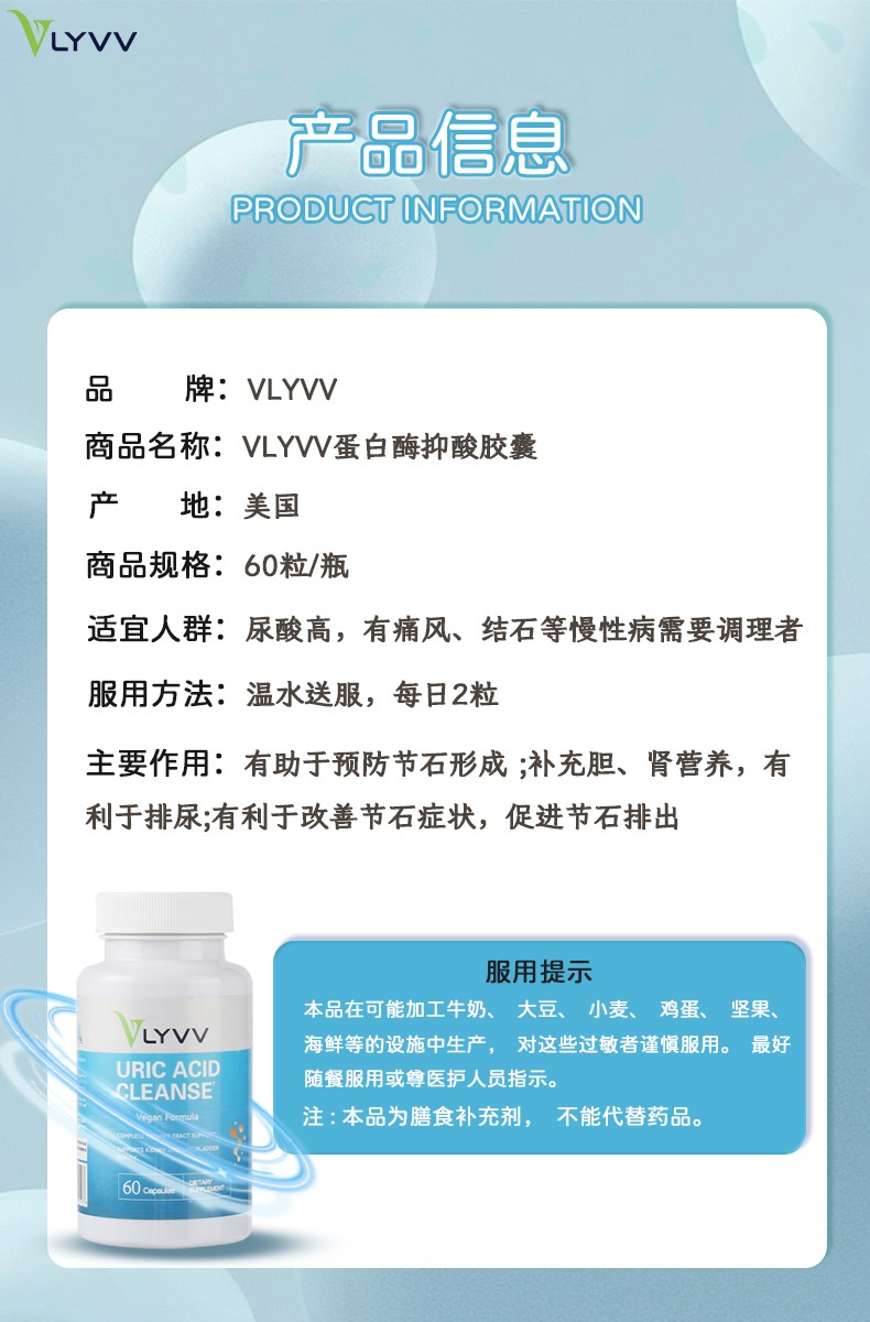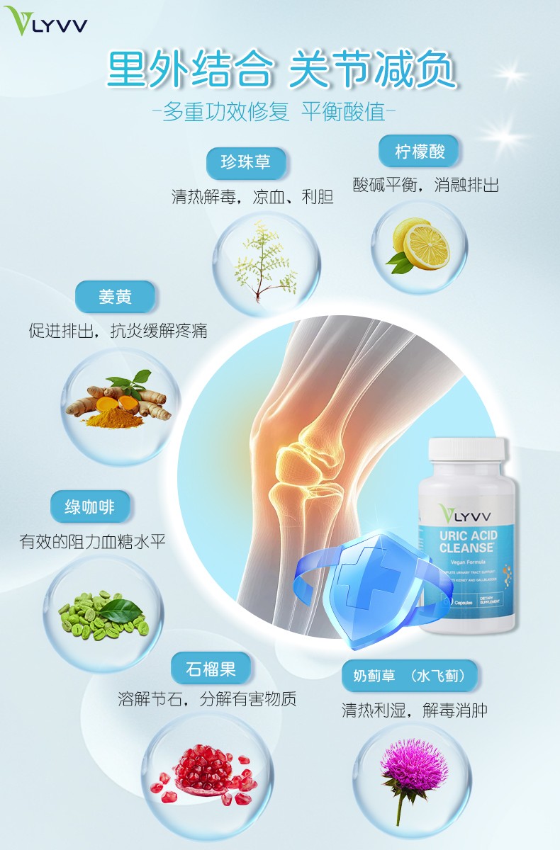 • 全面的关节和尿酸支持:VLYVV Uric Acid Cleanse 有助于维持关节健康,支持正常的尿酸水平,并帮助代谢体内多余的尿酸。